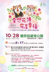 迎接2018台中世界花卉博覽會11月3日開幕,今年台中市民暨公教人員聯合婚禮活動將在10月28日於花博展區之一的豐原葫蘆墩公園舉行,婚禮將融合展區意象,用花開的聲音,為新人譜出畢生難忘的幸福樂章;聯合婚禮活動8月17日七夕當天在台中市政府台灣大道市政大樓惠中樓301會議室受理報名,名額共計200對,歡迎踴躍報名。