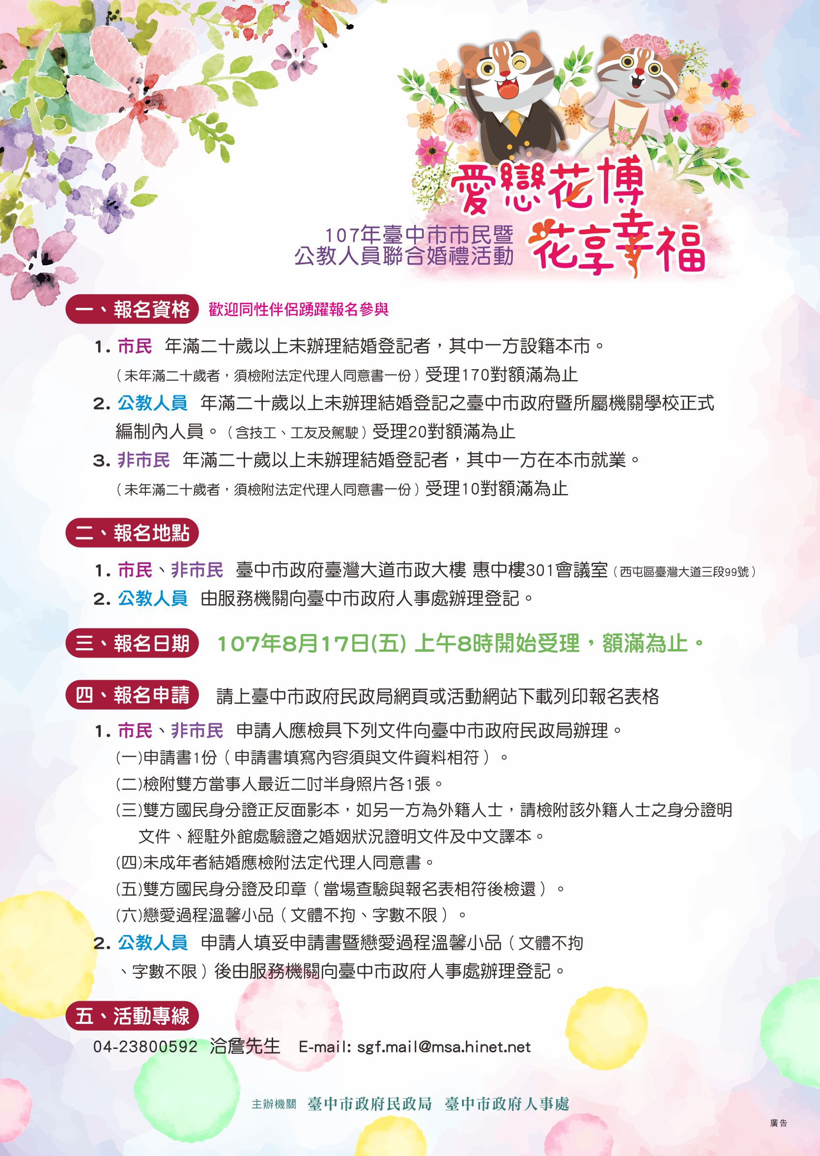 民政局提醒,凡年滿二十歲以上未婚民眾,只要其中一方設籍或工作地在台中市者均可報名,請於8月17日上午8時攜帶申請書1份、雙方當事人2吋半身照片各1張、國民身分證正反面影本及印章、戀愛過程溫馨小品等進行報名,如另一方為外籍人士,請檢附身分證明文件、經駐外館處驗證的婚姻狀況證明文件及中文譯本,也歡迎同性伴侶踴躍參與。(8/14*20)*民政局