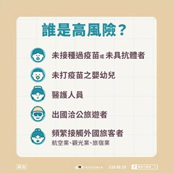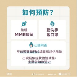 衛生局指出,麻疹傳染力強,可經由空氣、飛沫接觸傳播,出疹前後4天均具傳染力,接種MMR(麻疹、腮腺炎、德國麻疹)疫苗是預防麻疹的最有效的方法,近期東南亞及美洲地區麻疹疫情有升溫趨勢,請市民朋友如有旅遊規劃,請先至旅遊醫學門診諮詢醫師專業意見,或經醫師評估自費施打MMR疫苗,且應避免帶未滿1歲或未接種MMR疫苗的幼兒到流行地區。