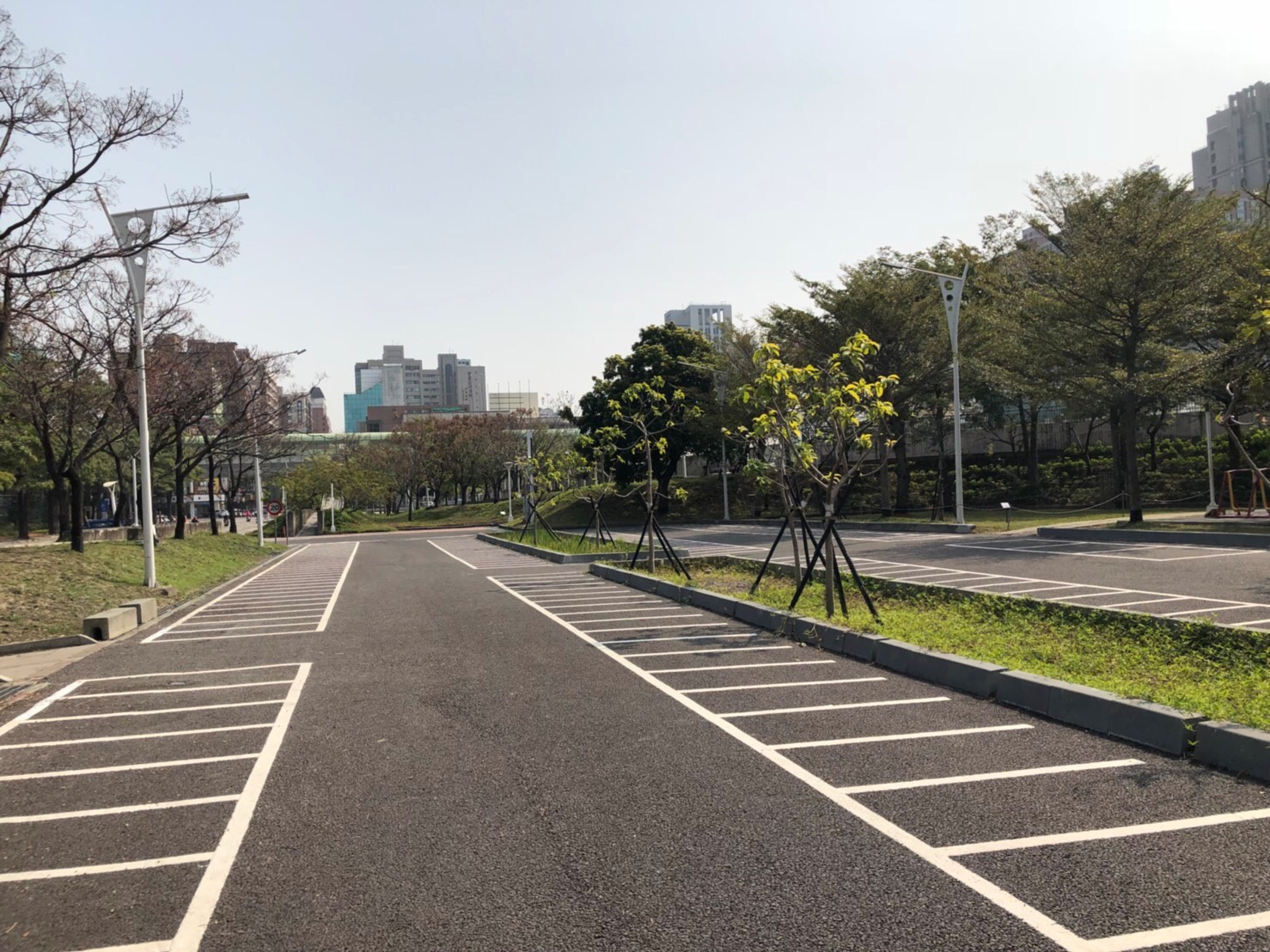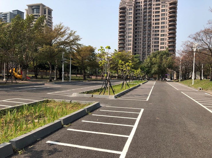 同時,也將公園停車場鋪面也改善為多孔隙透水瀝青,增加排水功能,一方面在「雨水花園」上方種植喬灌木等綠帶;一方面可成功改善原本排水性不佳的機車停車場,同時兼顧安全及永續環保。