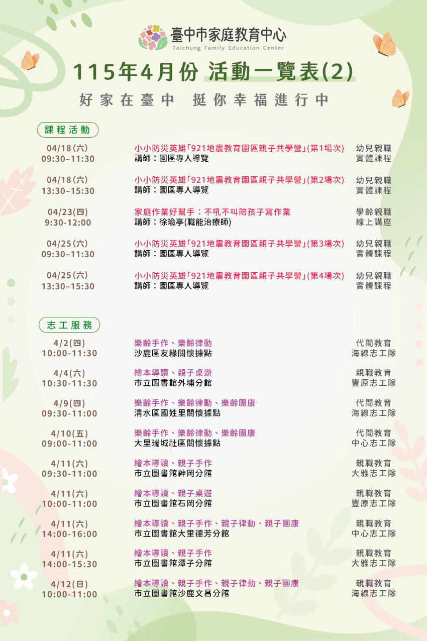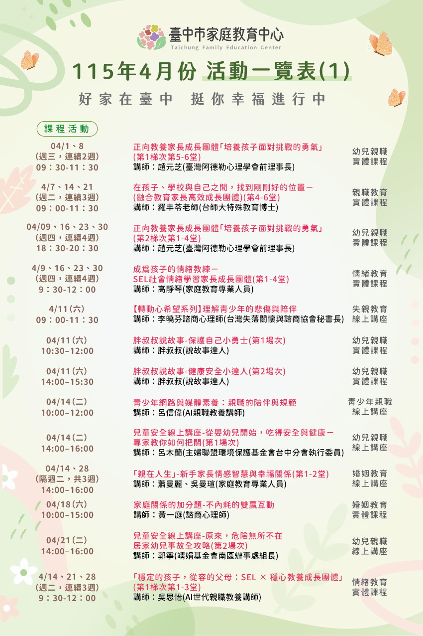 更多詳細內容洽本中心活動海報、FB及LINE公告資訊