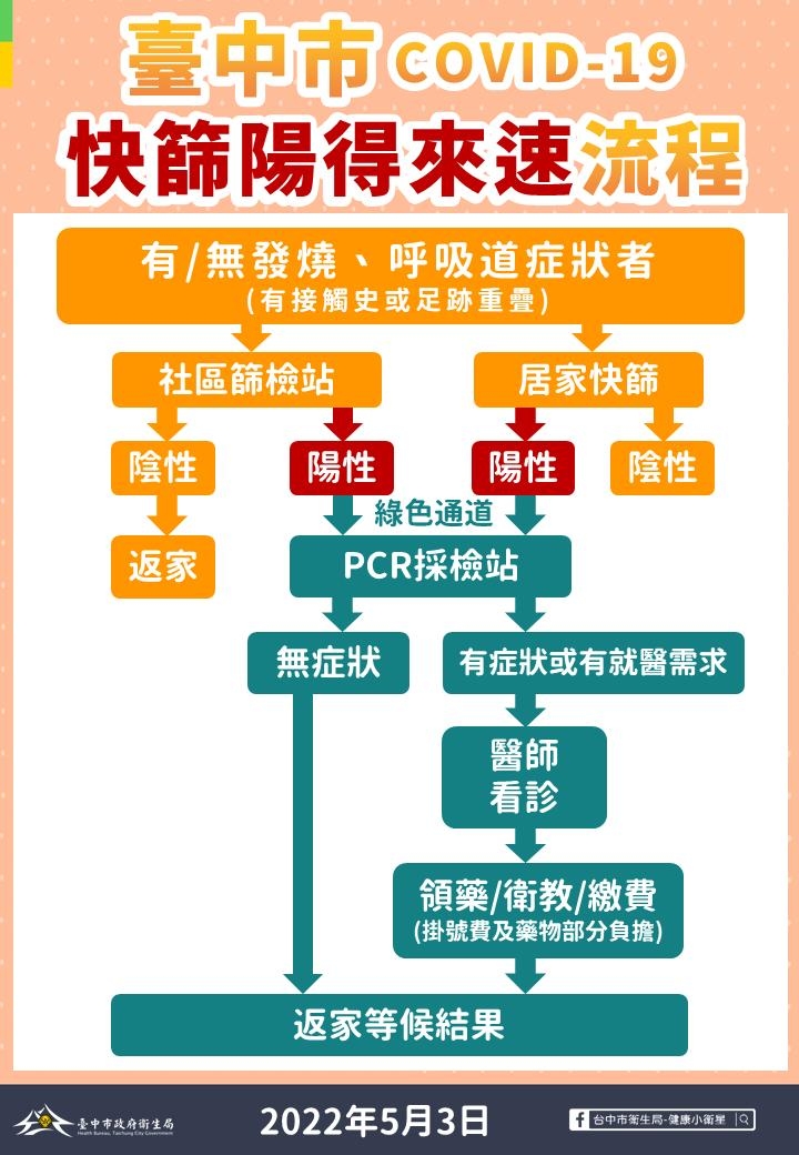 全國今(3)日本土確診新增2萬3102例,台中市本土個案新增1196例,其中有495位確診個案為接觸者發病,包含校園群聚124例、職場群聚101例、家庭朋友群聚270例;市長盧秀燕今日持續透過遠端視訊主持防疫記者會,她指出,有鑒於確診數越來越多,民眾篩檢需求大增,台中與各大醫院合作實施「快篩陽得來速」機制,目前已有6家醫院開設「綠色通道」安排醫師看診,當下就能領藥、衛教及繳費,大幅節省就醫時間。