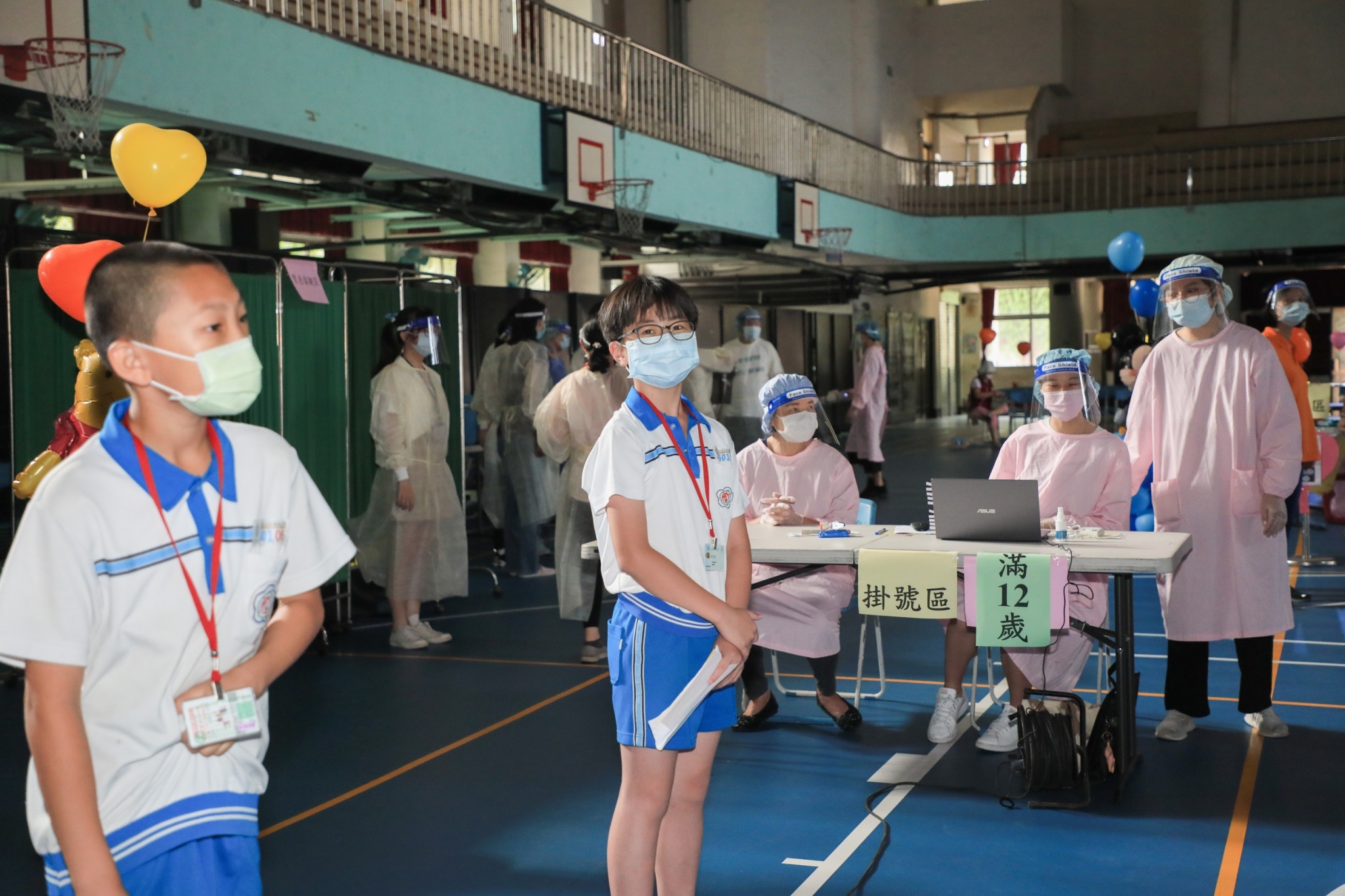 她特別感謝學校將現場布置的溫馨歡樂,有五彩繽紛的氣球,還有老師穿上騎著恐龍的卡通人物,舒緩孩童施打疫苗的緊張情緒,學校家長會也貼心為孩童提供電解質飲料。