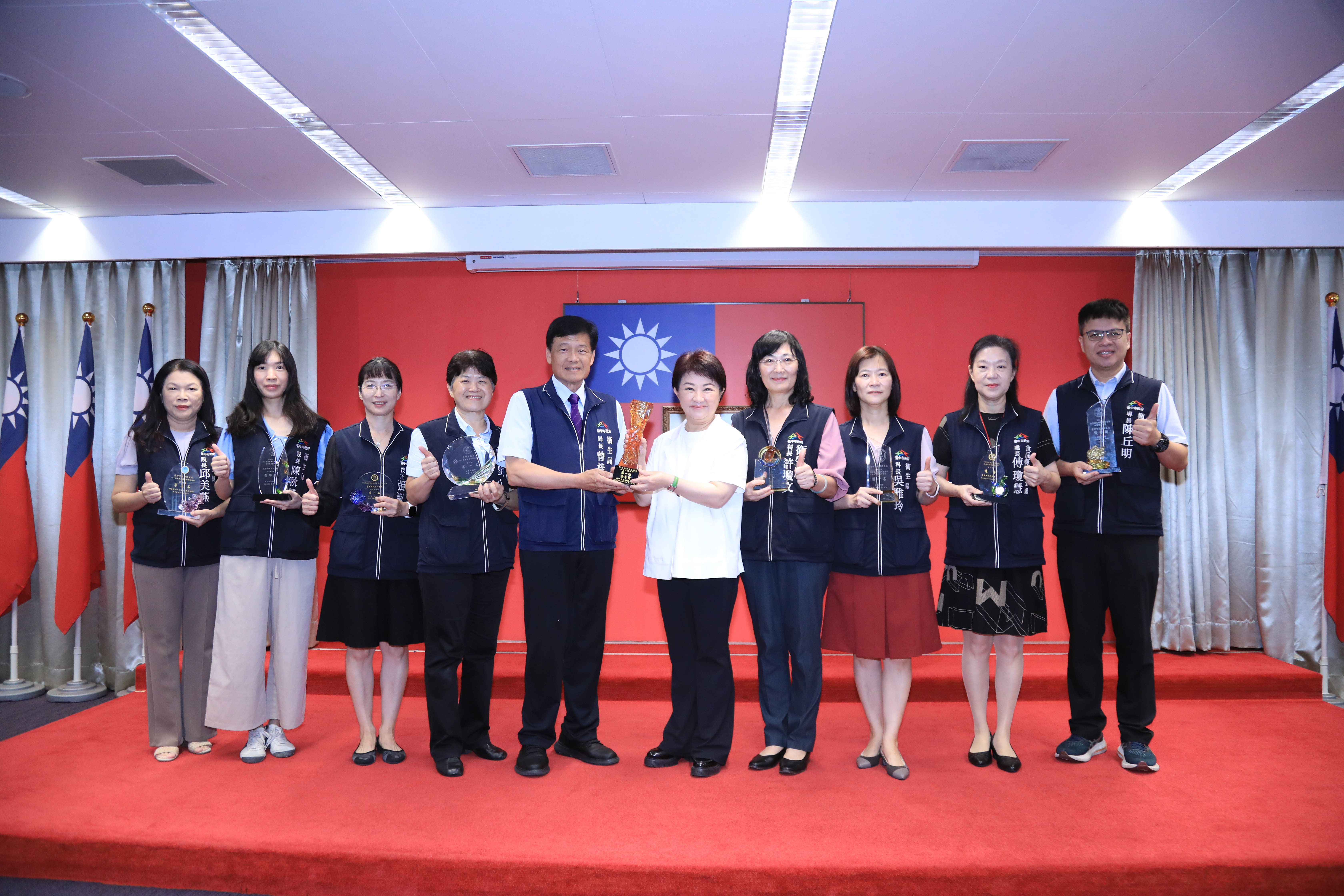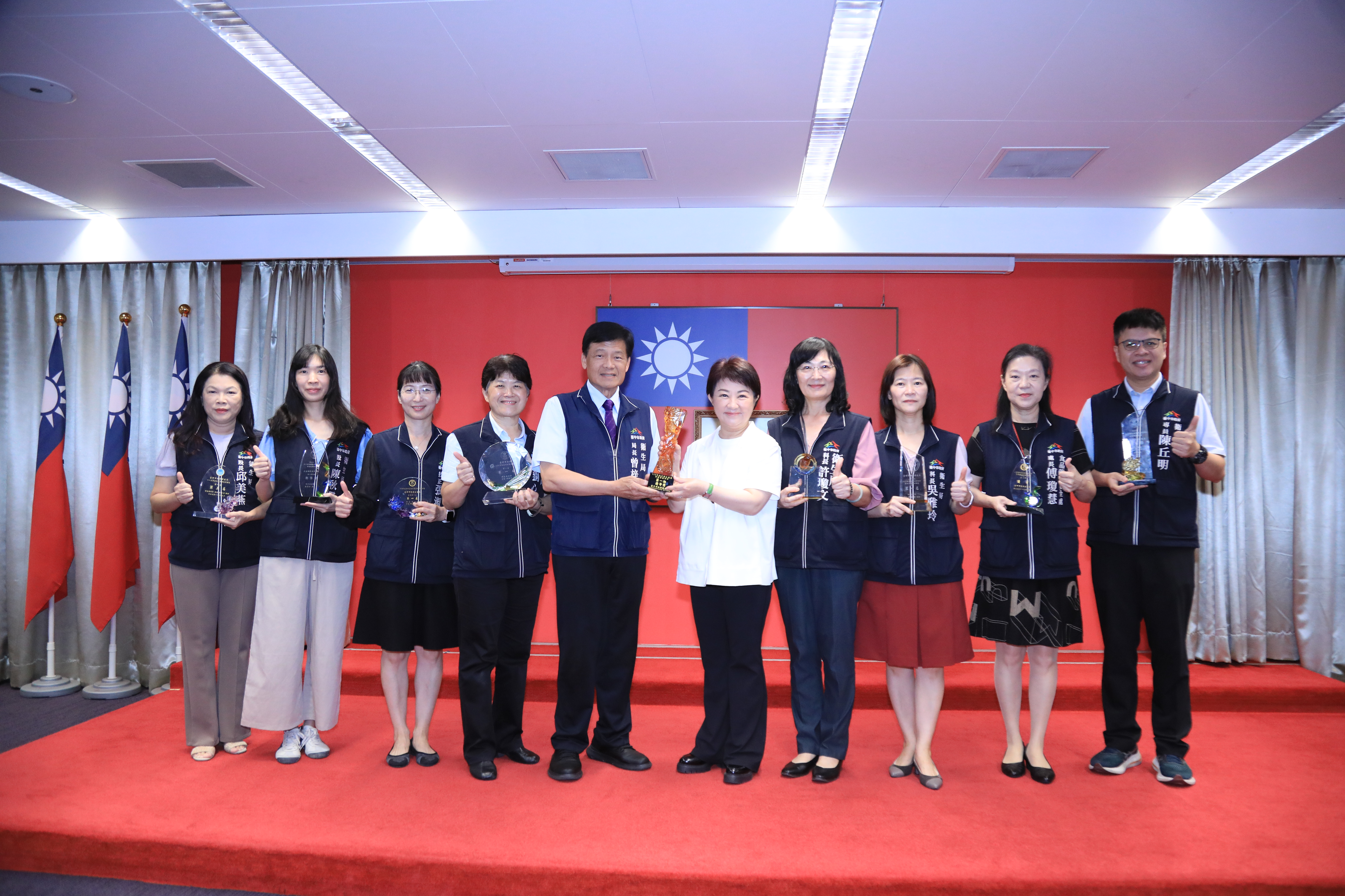 獻獎--臺中市政府衛生局榮獲113年地方衛生機關業務考評綜合獎項--含綜合獎、衛生教育業務、長期照顧業務、醫政業務第1名及其他優等獎共9項業務績優,與市長合影
